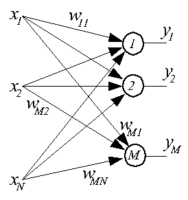 Сетями с самоорганизацией называются сети, не требующие для своего обучения "учителя" и самостоятельно адаптирующие свои веса под обучающие данные. Такие сети строятся из нейронов типа WTA и подобных им. Как правило, это однослойные сети, в которых каждый нейрон получает все компоненты входного вектора X размерностью N. На рисунке представлена структурная схема такой сети.
