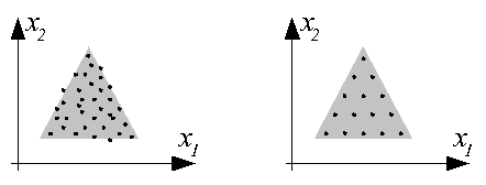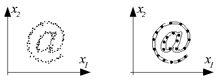Примеры результатов обучения, близких к оптимальным, представлены ниже на рисунках. Используются сети с 15 и 22 нейронами и двухкомпонентным входным вектором X=[x1, x2]T. На левых рисунках представлено распределение данных в обучающих выборках, на правых - распределение весов нейронов обученной сети.