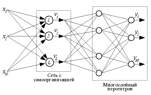 1. Сначала на множестве входных векторов стандартным образом обучается сеть с самоорганизацией. По завершении обучения веса всех нейронов фиксируются. В дальнейшем выходные сигналы нейронов рассчитываются следующим образом: