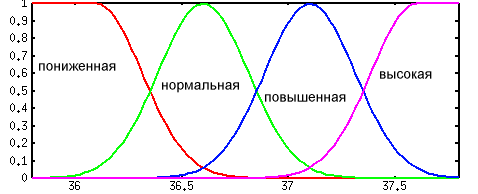 На представленном ниже рисунке даны графики функций принадлежности для множеств, связанных с лингвистической переменной "температура тела человека".