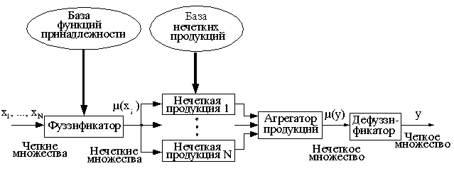 Поступившие на вход значения (например, результаты измерений на реальном физическом объекте) xi, i=1,2, ... , N, преобразуются в значения mu(xi) функций принадлежности нечетких множеств, с которыми оперирует ПС. Интепретатор ПС выбирает из базы нечетких продукций все применимые к входным данным продукции и определяет функции (???) принадлежности переменных y из правой части продукций. Поскольку в общем случае применимыми оказываются несколько продукций, то возникает проблема агрегирования функций принадлежности из правыхчастей отдельных продукций. Это объединение функций принадлежности реализуется, как правило, оператором логического сложения. Нечеткий результат в виде функции принадлежности mu(y) трансформируется дефуззификатором в конкретное значение выхода y.