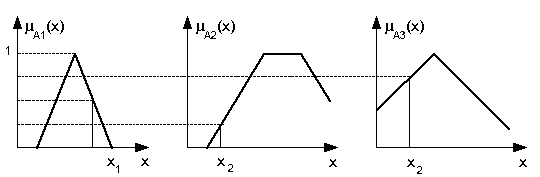 Пример. Пусть на вход нечеткой ПС поступают 2 величины x1 и x2.Фуззификатор, используя базу функций принадлежности всех известных ему нечетких множеств, определяет значения коэффициентов принадлежности. Отличными от 0 оказались три коэффициента принадлежности muA1(x1)=0,5, muA2(x2)=0,25, muA3(x2)=0,75 для трех нечетких множеств A1, A2 и A3, как это показано ниже.