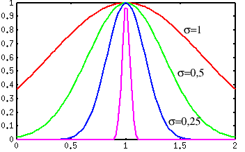 Функция Гаусса для переменной x с центром c и параметром ширины s имеет следующий вид
