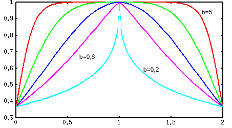 Легко заметить, что подбором параметра формы b обощенной функции Гаусса можно придать треугольную и трапецеидальную формы. Обобщенная функция Гаусса может быть также представлена в рациональной форме