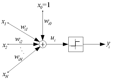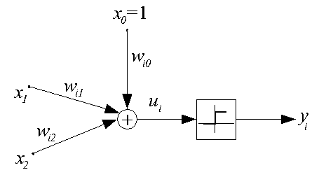 Для такого нейрона ui=wi0+wi1x1+wi2x2. Это выражение определяет плоскость в трехмерном пространстве <x1, x2, ui>, эта плоскость пересекается с плоскостью <x1, x2> по линии, определяемой уравнением
