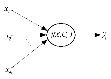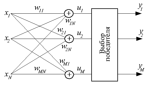 Каждый конкурирующий нейрон в группе получает одни и те же входные сигналы. Каждый нейрон рассчитывает выходной сигнал своего сумматора обычным образом ui=sum[j=1:N](wij*xj). По результатам сравнения всех ui, i=1, 2, ..., M, выбирается нейрон-победитель, обладающий наибольшим значением ui. Выходной сигнал yi нейрона-победителя получает значение 1, выходные сигналы всех остальных нейронов - 0.
