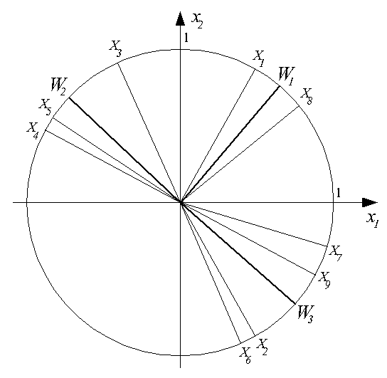 Предположим, что i-ый инстар был обучен на единственной положительной эталонной паре <X1, 1>. При этом вектор входных весов инстара Wi=[wi1, wi2, ...,wiN]T=X1. В режиме классификации на вход инстара подается вектор X2, тогда на выходе вырабатывается сигнал