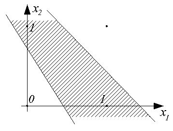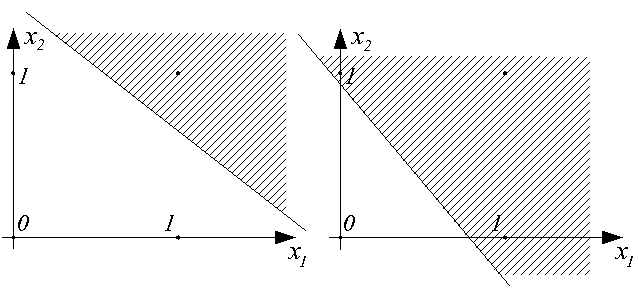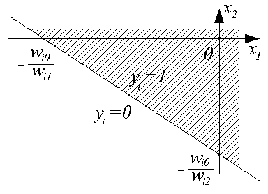 Эта линия разбивает пространство входных сигналов <x1, x2> на две области: в одной из них (заштрихованной) значения ui>0, и, следовательно, функция активации принимает значение 1; в другой - ui<0, и yi=0.