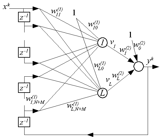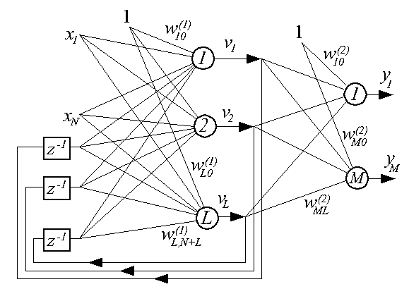 Данные сети получаются из однонаправленного многослойного персептрона MLP введением обратных связей с задержкой с выхода на вход сети, поэтому они получили название RMLP (Recurrent MultiLayer Perceptron). На рисунке дана структурная схема двухуровневой сети с одним входом, одним выходом и L нейронами в первом слое нейронов ("1-L-1").